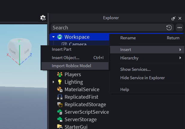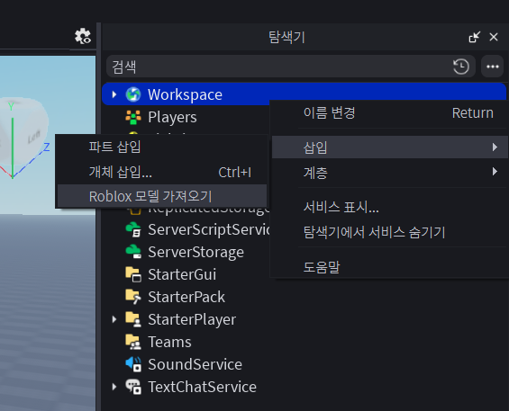 2. Workspace를 우클릭한 후, Insert - Import Roblox Model을 클릭합니다.